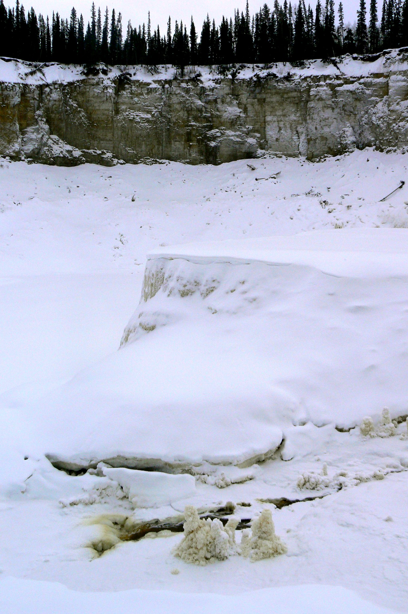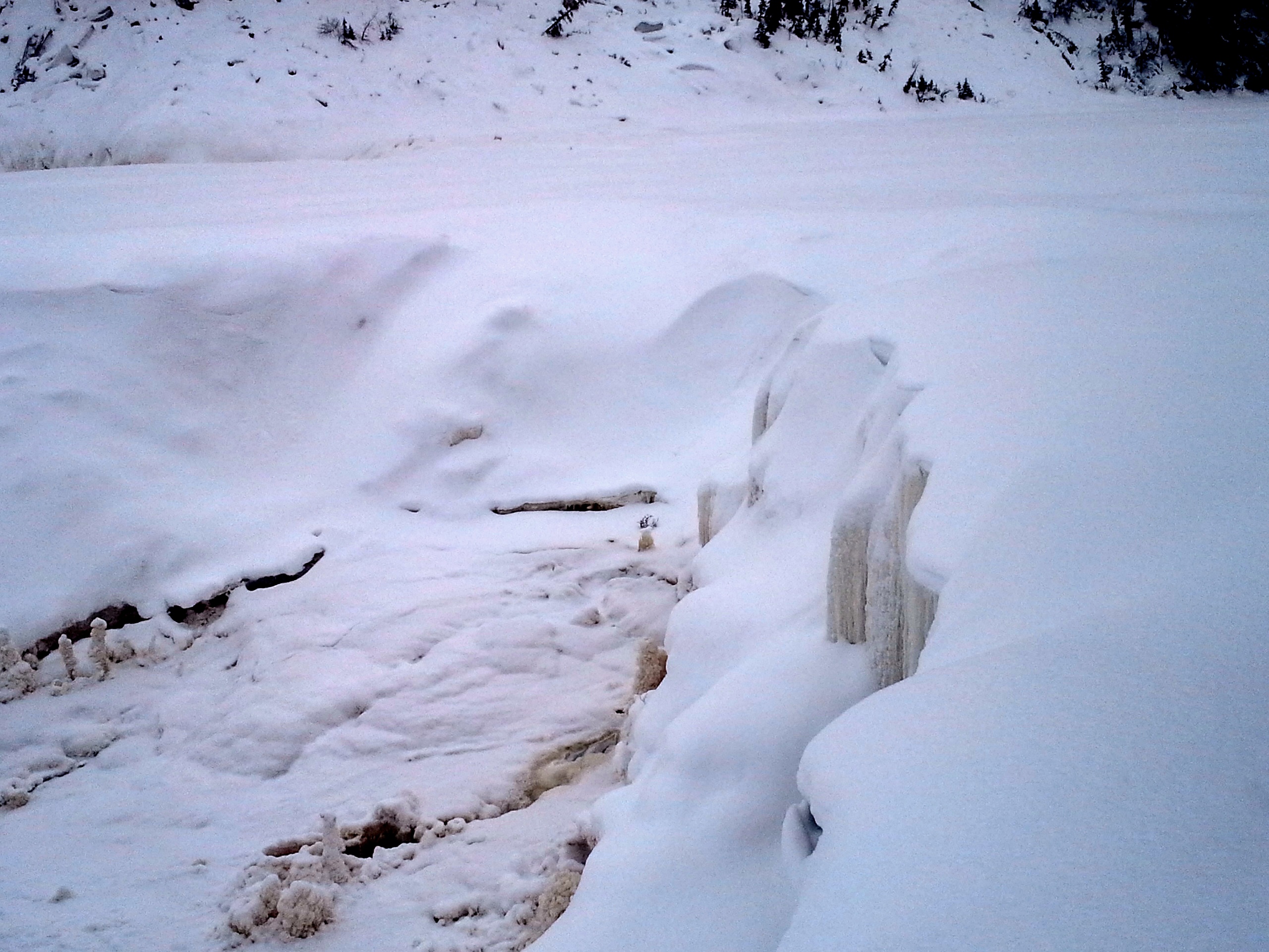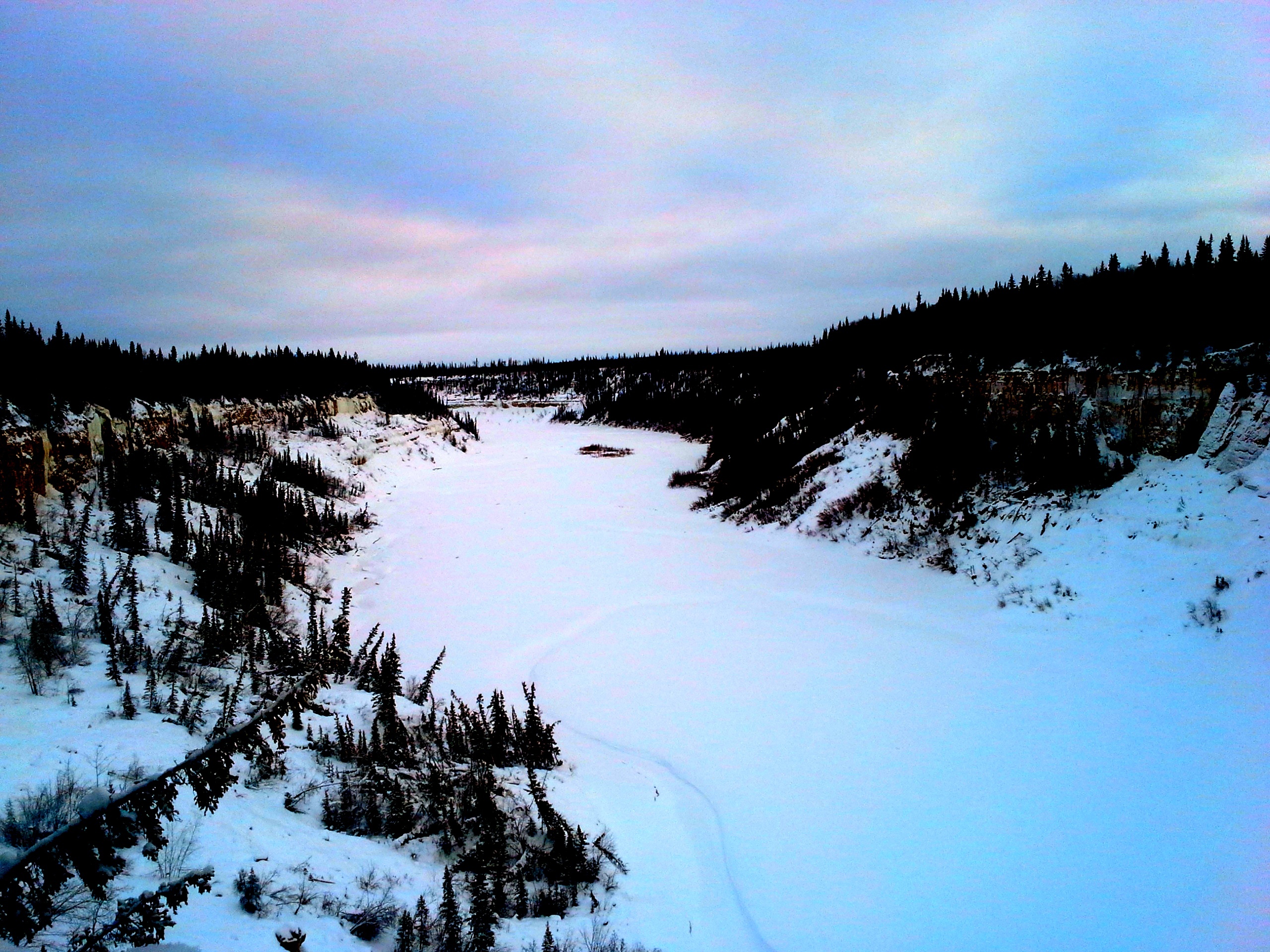 Samedi après-midi, amie nordique sans passeport, chum sans passeport et moi sommes allés en raquettes au Twin Falls Gorge Territorial Park, à environ 40 km au sud de Hay River. À chacun de mes trois voyages aux TNO, je suis allée voir la chute Alexandra, qui semble être un arrêt obligatoire (et très joli!) pour apprécier la nature nordique à tous les moments de l’année. Cette fois-ci, nous avons laissé Versa sans passeport à côté de l’autoroute, puis marché pour nous rendre au camping de Louise Fall, pour ensuite descendre sur la rivière et nous rendre assez près d’Alexandra et faire le chemin inverse. Le tout a pris 2h30, il faut dire que nous avons eu la chance d’avoir des traces déjà faites, ce qui a grandement facilité la tâche! Nous aurions donc pu le faire beaucoup plus rapidement, en prenant un peu moins de photo… Mais comme nous avons pris pluuuusieurs photos, en voici quelques-unes pour vous donner une idée de l’endroit que j’espère bien revisiter en été.