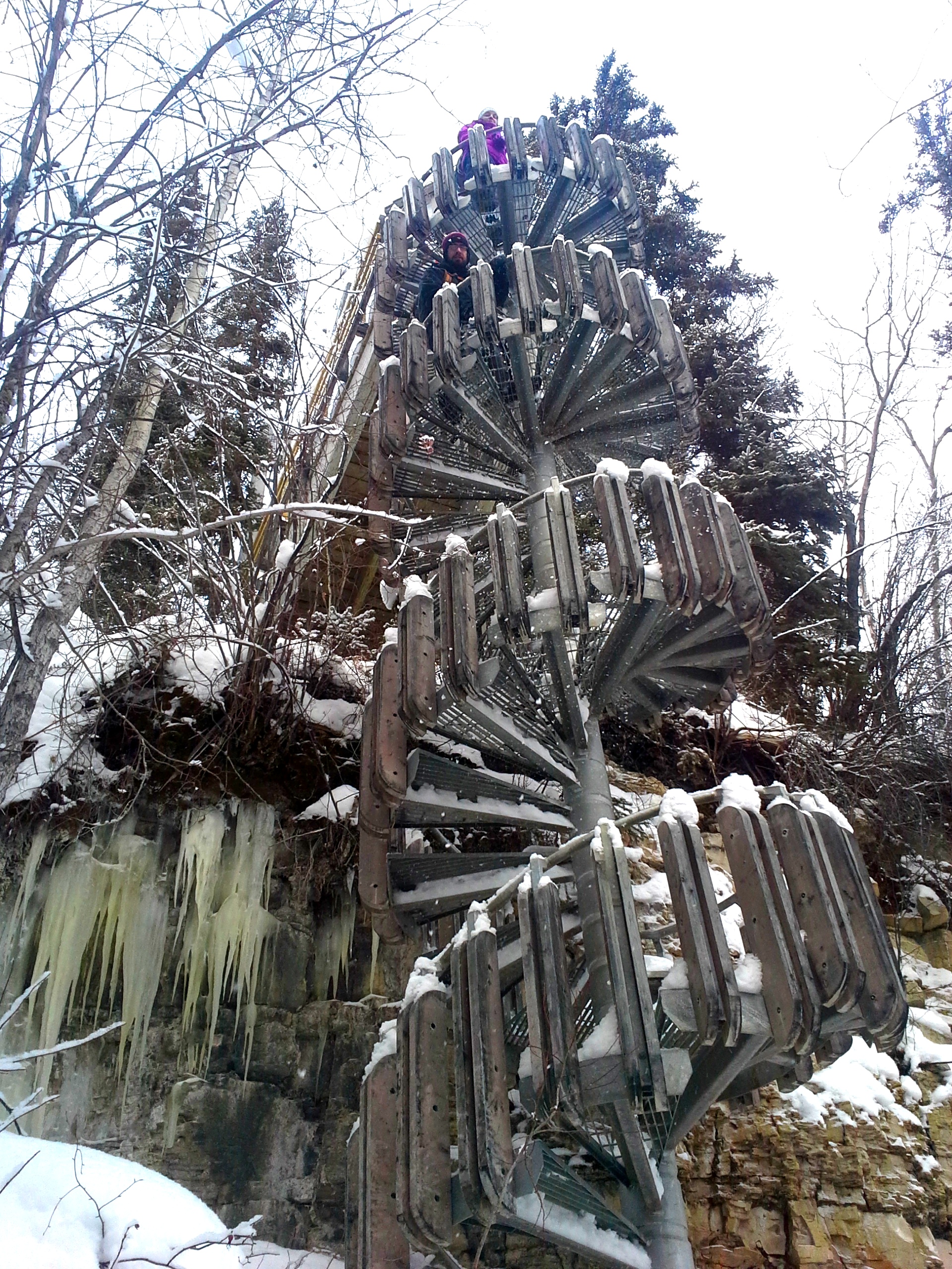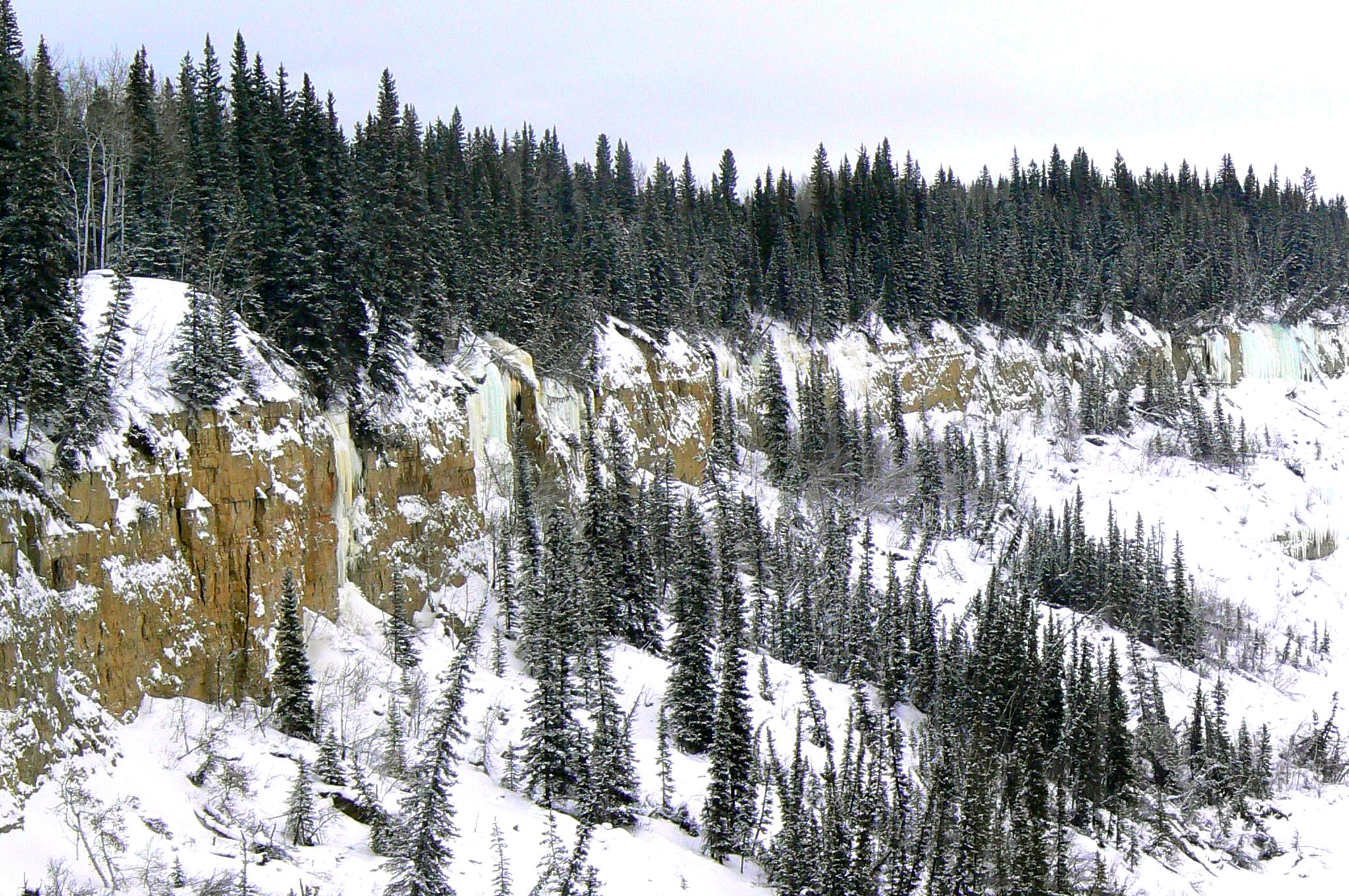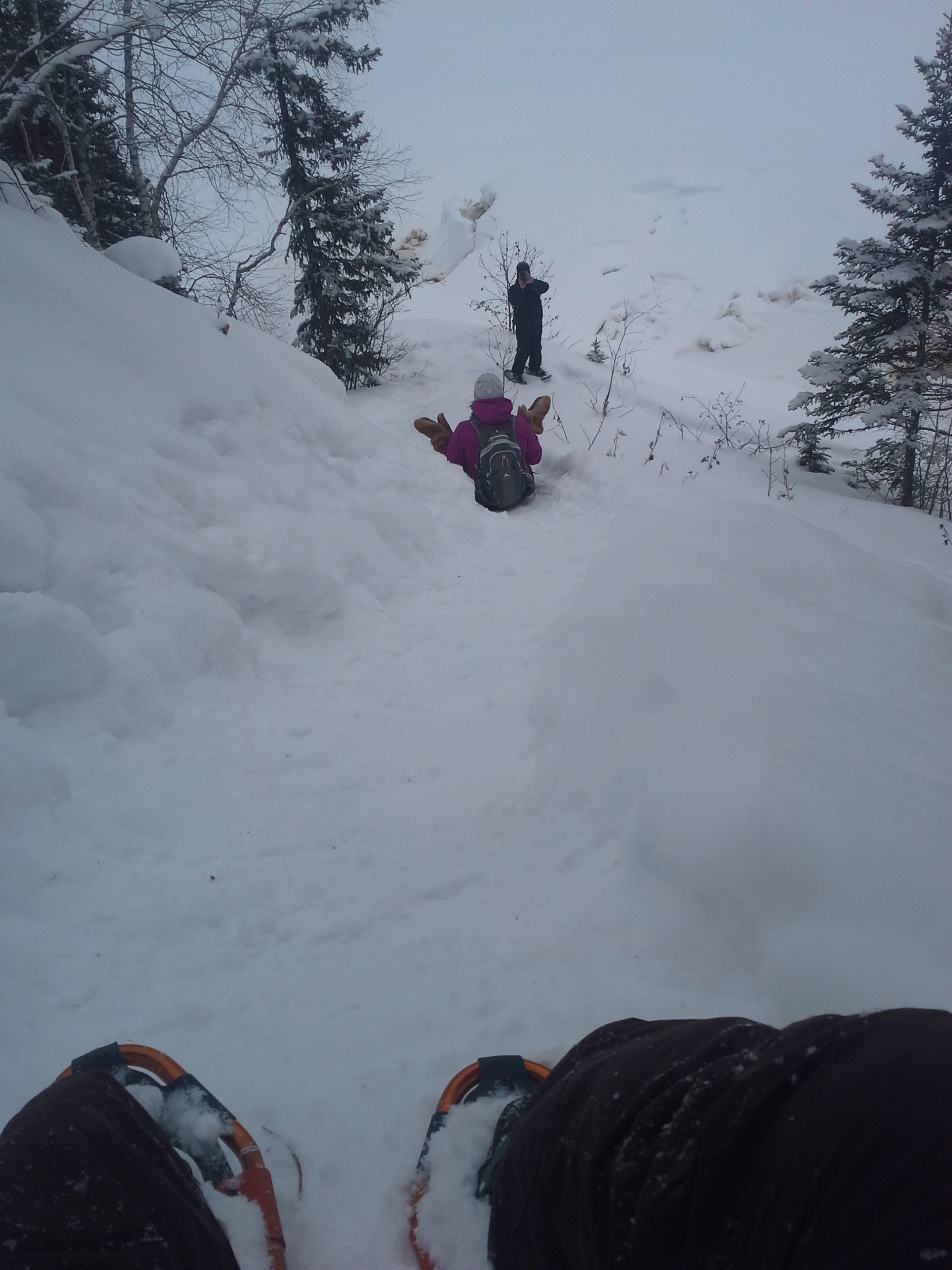 Samedi après-midi, amie nordique sans passeport, chum sans passeport et moi sommes allés en raquettes au Twin Falls Gorge Territorial Park, à environ 40 km au sud de Hay River. À chacun de mes trois voyages aux TNO, je suis allée voir la chute Alexandra, qui semble être un arrêt obligatoire (et très joli!) pour apprécier la nature nordique à tous les moments de l’année. Cette fois-ci, nous avons laissé Versa sans passeport à côté de l’autoroute, puis marché pour nous rendre au camping de Louise Fall, pour ensuite descendre sur la rivière et nous rendre assez près d’Alexandra et faire le chemin inverse. Le tout a pris 2h30, il faut dire que nous avons eu la chance d’avoir des traces déjà faites, ce qui a grandement facilité la tâche! Nous aurions donc pu le faire beaucoup plus rapidement, en prenant un peu moins de photo… Mais comme nous avons pris pluuuusieurs photos, en voici quelques-unes pour vous donner une idée de l’endroit que j’espère bien revisiter en été.